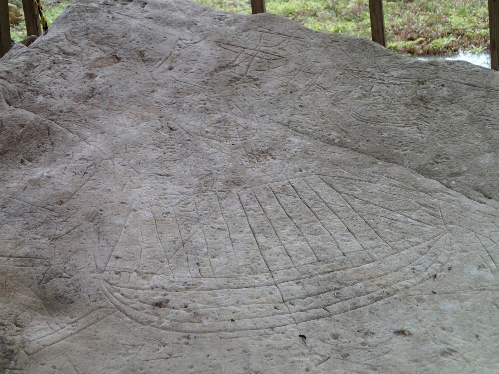岩に書かれた線刻画がはっきりとわかります。船の絵です!