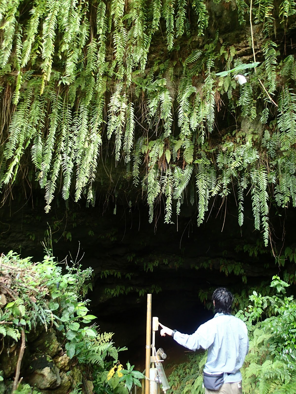 右奥から水が湧いていて、左側の地中の洞窟(水路?)に流れこんでいきます |
