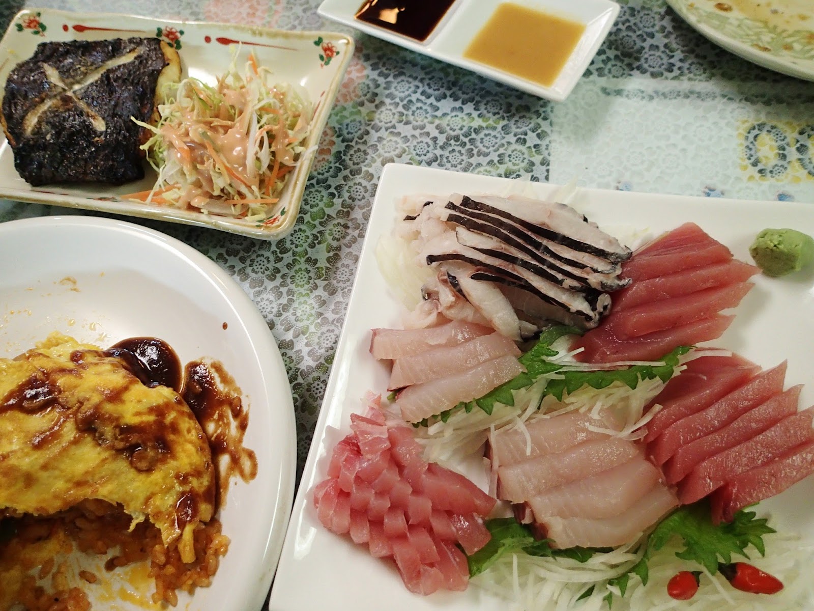 ひらみスパとサワラ・マグロ・ナワキリの刺身、ナワキリの塩焼き、フチャンプルー、オムライスで2人で3400円。