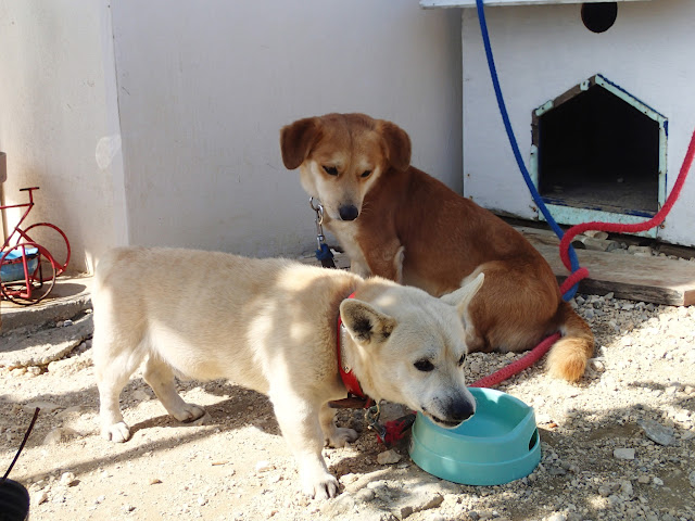 | 白い方が大東犬。大東犬は足が短い。茶色い犬は凶暴で飛び掛ってきて東さんがかまれそうになった。 |