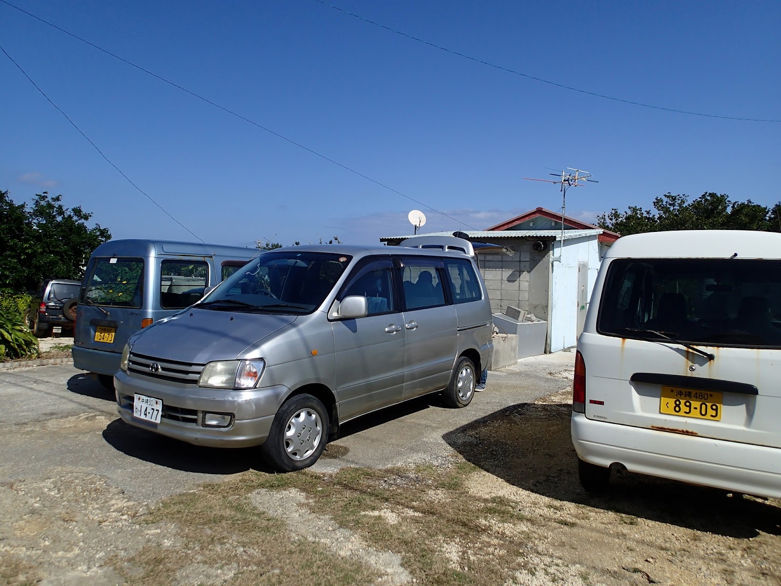 私たちが借りるのはこの真ん中のデカイ車だということなんだけど、島の中は狭い道もあるかも知れないから右の軽にしてもらいました。