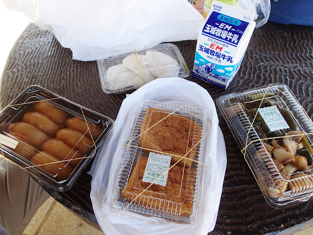 昼はケンちゃんストアでお惣菜とモチ、Aコープで島寿司を買って公園で食べました。