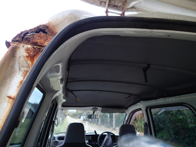 ドアの継ぎ目からかな?オイオイオイ。後ろの席も同じ具合で荷物もベチャベチャです。大変だぁこりゃ~。