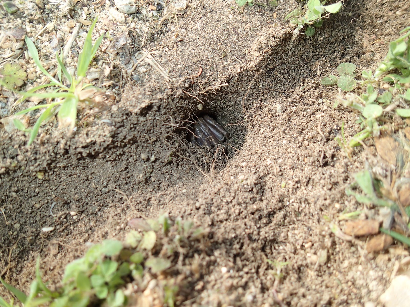 テントの下からカニ穴が!出ようと頑張ったのか左右に伸びるトンネル!! |