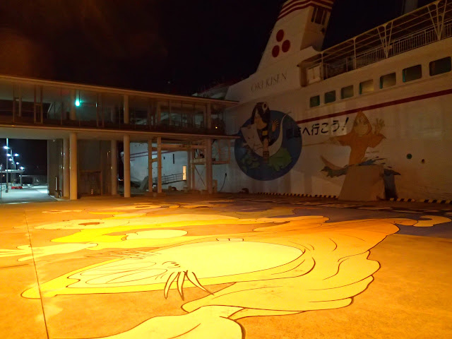 スーパーひまりで買い物をしたあと、夜の西郷港でフェリーしらしまを見た。