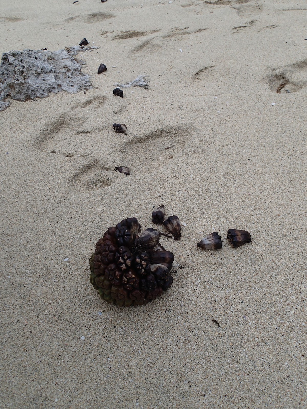 | アダンの実がほぐれて点々と落ちていた。ヤシガニが食べたの? |