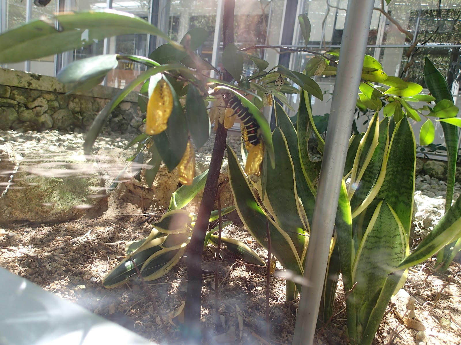 建物の中には中庭があり、金ピカに輝く蛹がたくさんぶらさがっています。自然にたくさんのオオゴマダラが集まってくるのだそう。島の加工品、ゴマ、ソラマメ何でもそろう場所です。